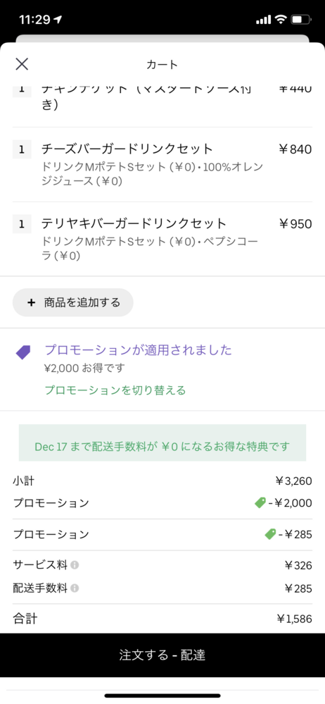 Ubereatsで注文したいのですが、配送手数料が無料になると記載が